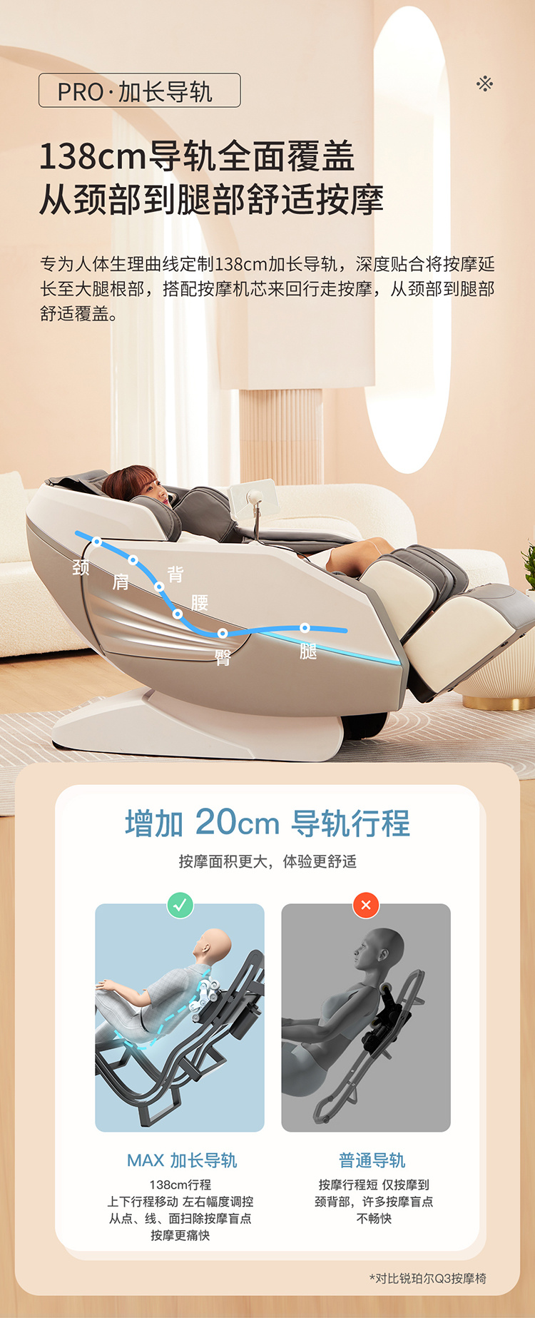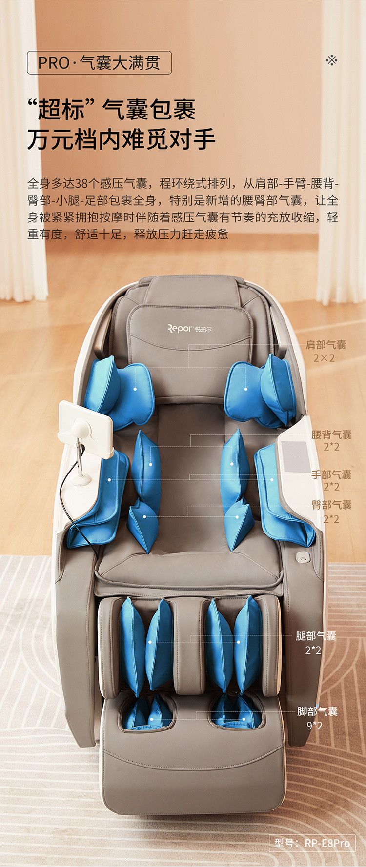 • 产品简介:锐珀尔新品按摩椅E8 Pro拥有温感养生系统,3D摆揉机械手,十大按摩手法,138cm超长SL按摩导轨,腿足一体按摩等功能,并且有无线充的一款新品按摩椅,价格不贵,重在享受。