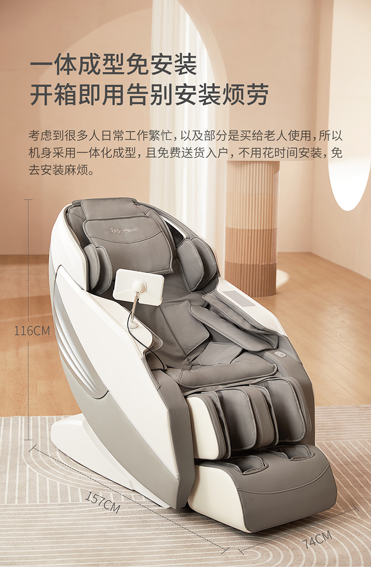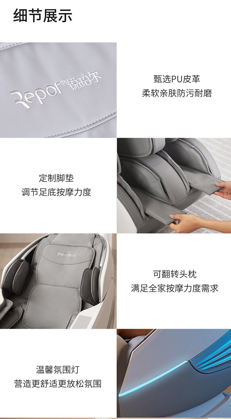 锐珀尔集十余年技术积累,倾力打造锐珀尔新款按摩椅4D穴感总裁椅,拥有全新的AI智能语音,小腿温热揉搓、脚底震动、4D机械手等全新功能创新,智能健康体测,可以检测血氧、心率、微循环等数值,通过大数据分析,给您提供合理的改善方法,时刻关注您的健康状况;超大液晶智能触控,专为总裁量身打造的特色按摩程序,20分钟快速补充精力,多种按摩程序,满足全家人的需求。