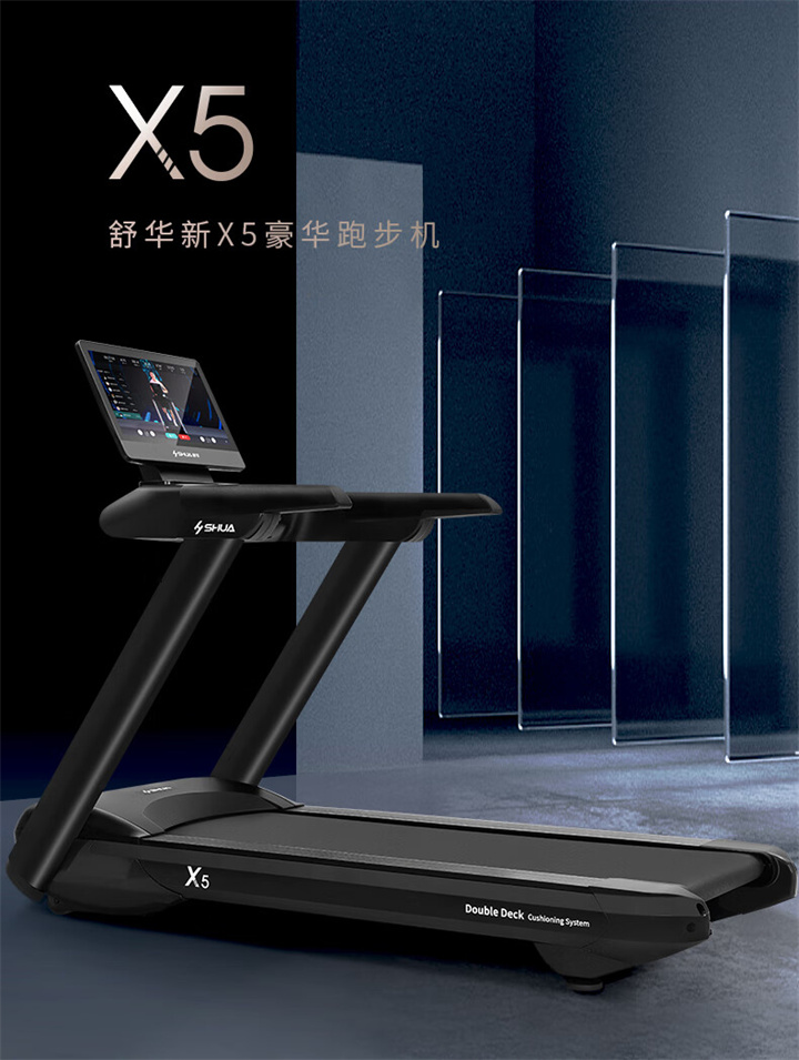 锐强体育推荐健身器材-舒华家用电动新X5跑步机 SH-T6500自2013年研发出X5之后,累计销量达76000多台,三种方式监测心率,耐久测试高出国标46.8倍,提升安全性能,拥有10.1寸IPS高清触摸屏、Z型动感时尚外观设计、70×150mm精钢立柱机身、F级高效静音马达、520mm商用豪华跑带和35mm双层全跑台减震跑板等优势,让您享受科学跑步。