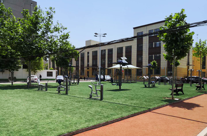 淄博某社区为了方便社区内人员使用健身器材,通过锐强体育的设计,合理布局,搭建了以舒华智能健身驿站为主的户外健身器材口袋公园
